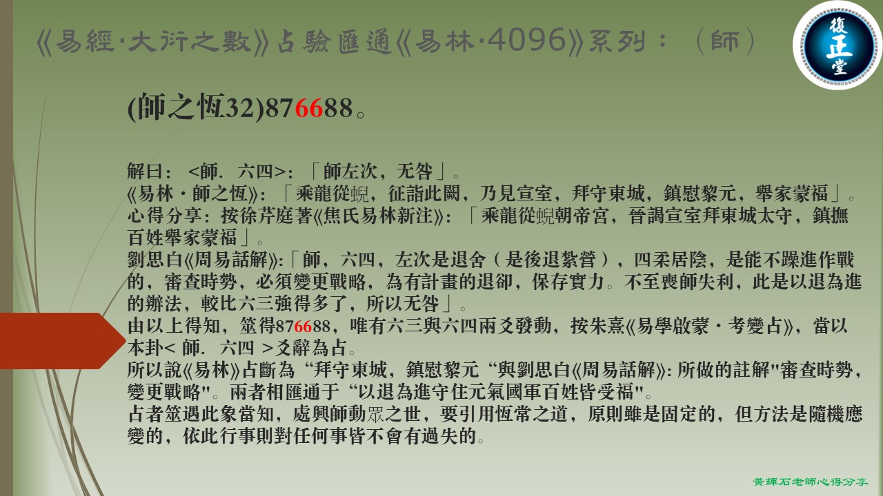 由以上得知,筮得876688,唯有六三與六四兩爻發動,按朱熹⟪易學啟蒙·考變占⟫,當以本卦< 師.六四 >爻辭為占。